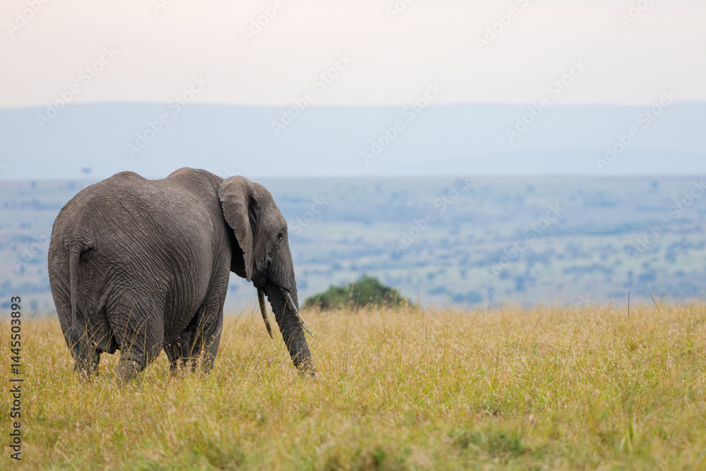Lone African elephant grazing and walking on open grassland in Masai Mara, Kenya. Wildlife safari in natural savannah habitat. Large herbivore in African landscape.