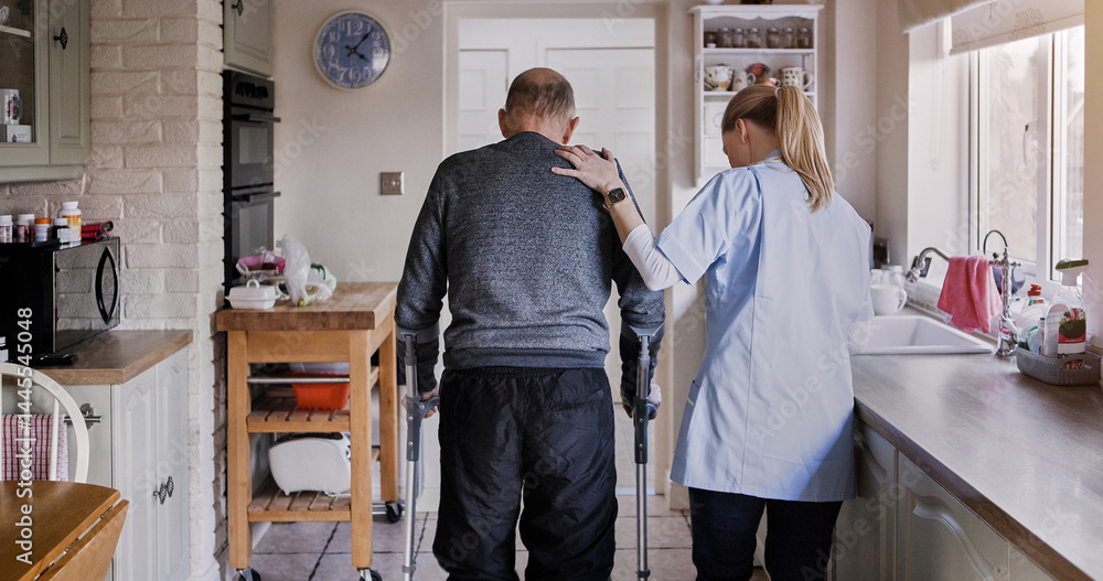 Nurse support senior man in crutches in home kitchen, medical rehabilitation and recovery. Caregiver back, person with a disability walk and help, health and physiotherapy, healing injury or accident
