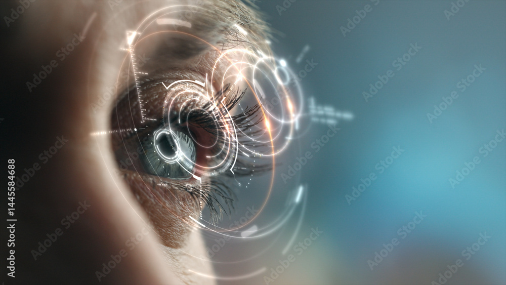 A detailed close-up of the human retina illuminated by a holographic display, projecting real-time data and interactive visual elements.