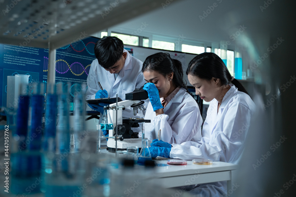 Three young scientists in lab coats working together in a laboratory examining a petri dish for microbiology biology and medical research with focus on education and innovation