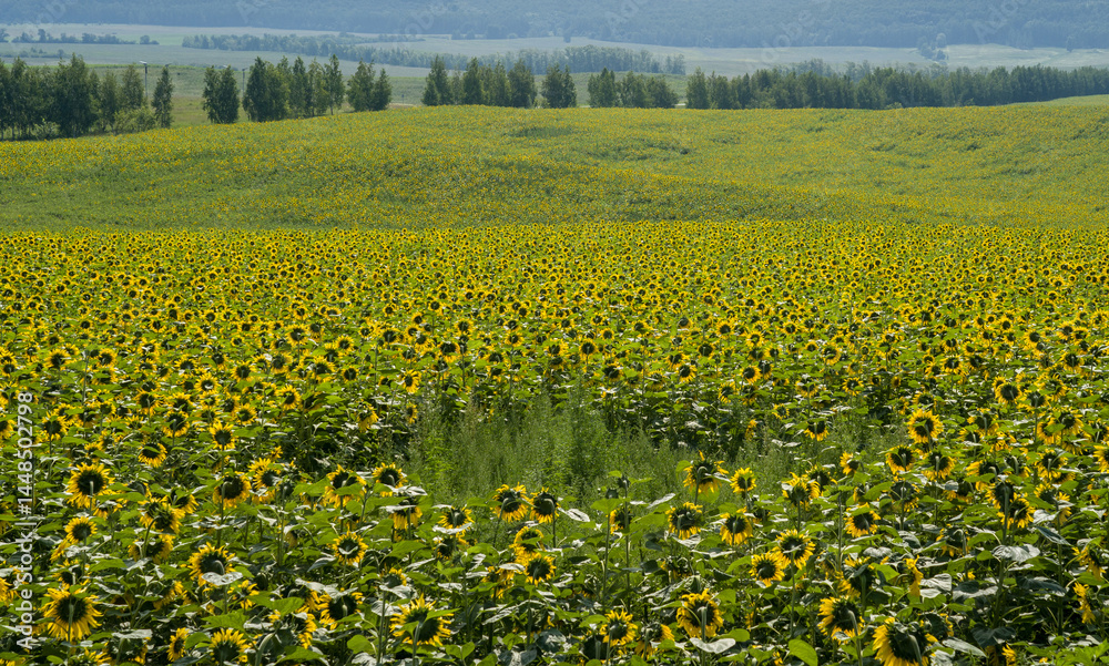 A field of blooming sunflowers against a backdrop of hills and forest.
