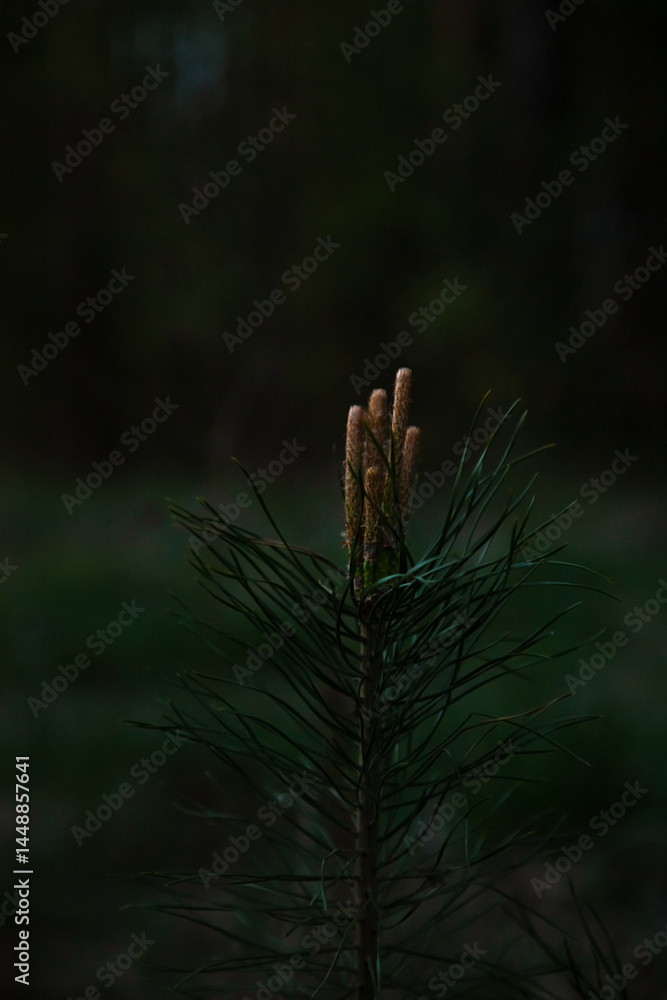 Small green pine needles with swelling bud on the forest spring background. Macro closeup portrait of fir tree