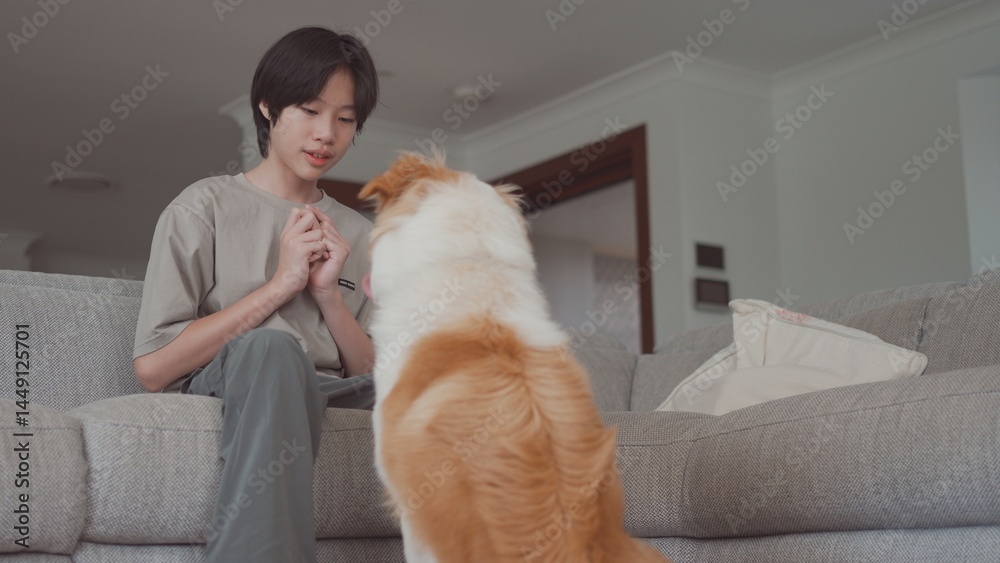 Preteen Asian boy playing with wheaten border collie puppy at home, family pet, positive mental health and wellness, pet therapy concept