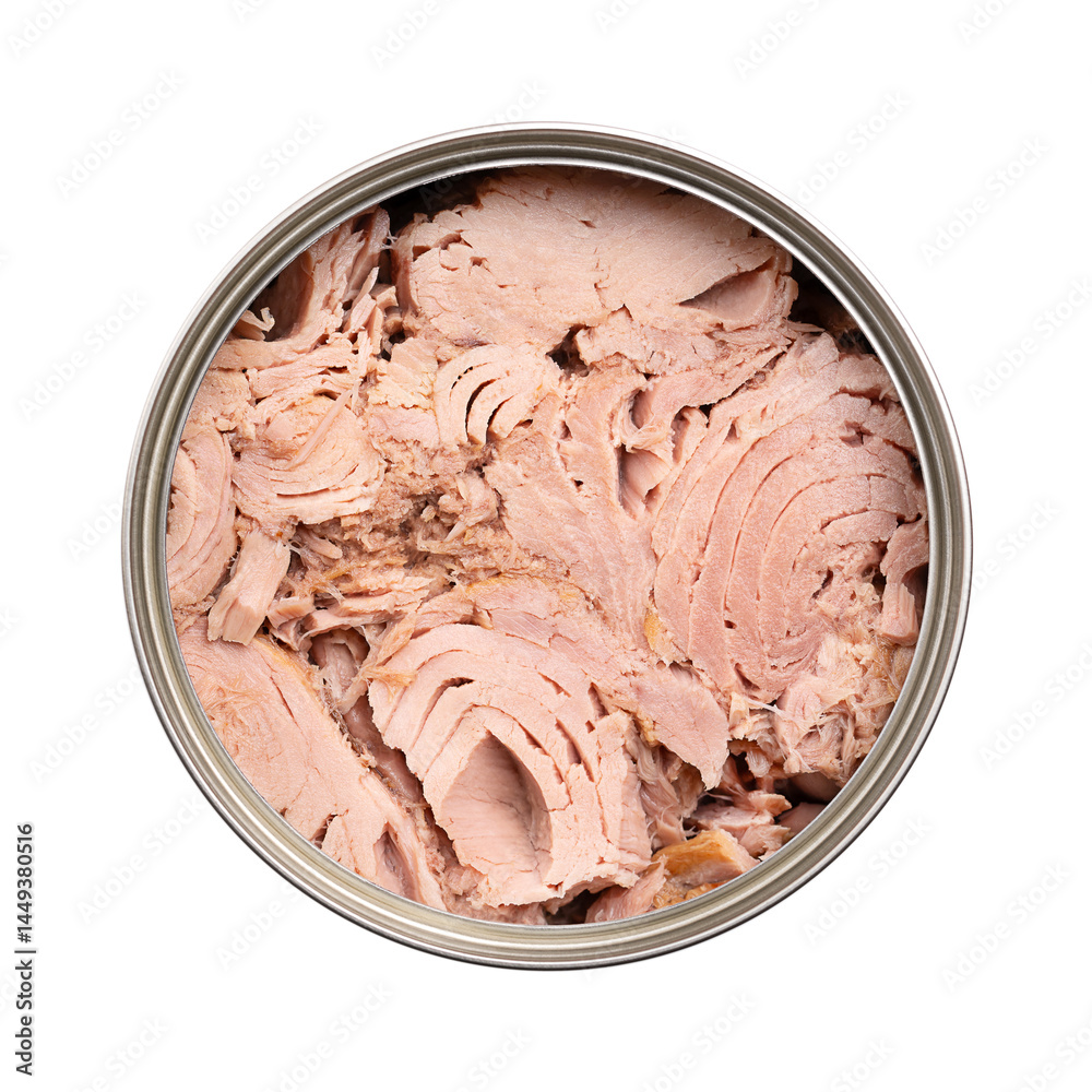 Canned tuna, tuna fish in its own juice in an open tin can, from above. Fillets of Skipjack tuna, Katsuwonus pelamis, preserved in liquid that naturally extracts from the fish during canning process.
