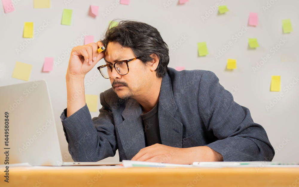 Upset businessman inside office, mature man with beard reading financial reports and account on laptop