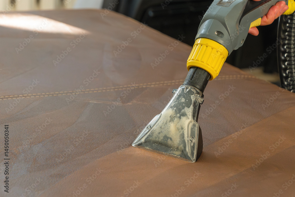 Cleaning a brown sofa with a washing vacuum cleaner. Spring Cleaning in the Apartment