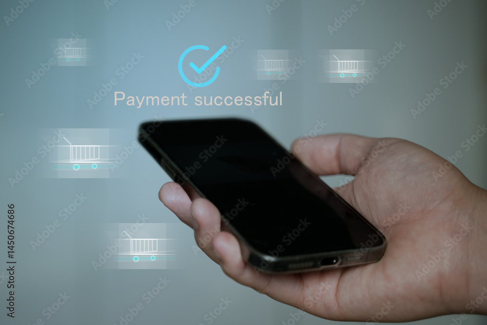Mobile Payment Success Notification with Hand Holding Smartphone and Blue Checkmark Icon in Virtual Interface.