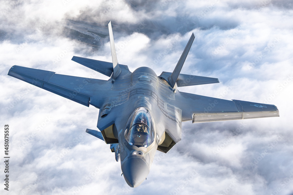 Very close top view of a pair of F-35C Lightning II over clouds in beautiful light