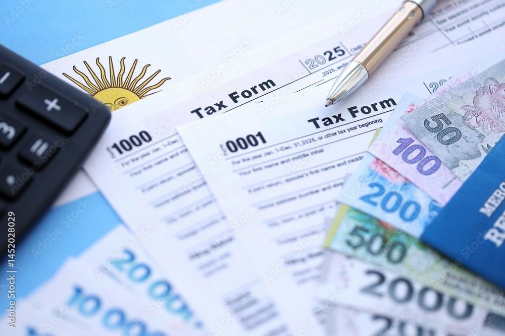 Argentine pesos money bills in big amount lies on table with pen, calculator, passport and tax forms