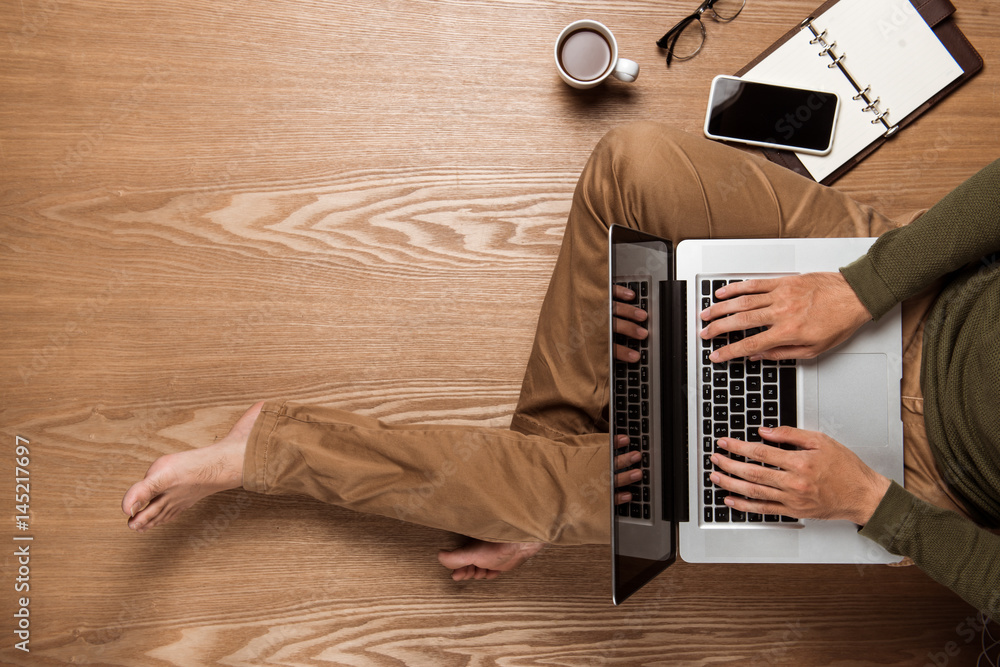 Business man hands using a laptop with a cup of coffee and smart phone with copy space.