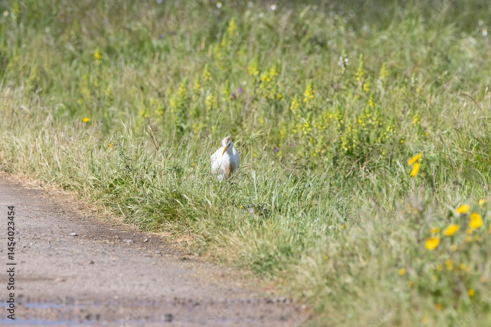 Cattle Egret (Bubulcus ibis) walking through green grass and yellow flowers in Arrocampo Bird Park, Extremadura, Spain. Spring wetland wildlife
