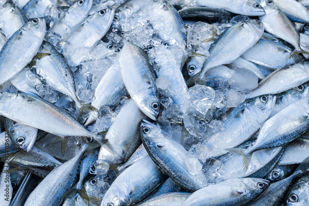 Fresh mackerel fishes on freezer shelf in supermarket, Close up shot.
