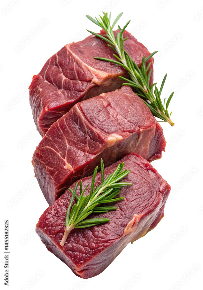 Three Raw Beef Steaks with Fresh Rosemary Sprigs Isolated on transparent background Delicious Red Meat Culinary Photography