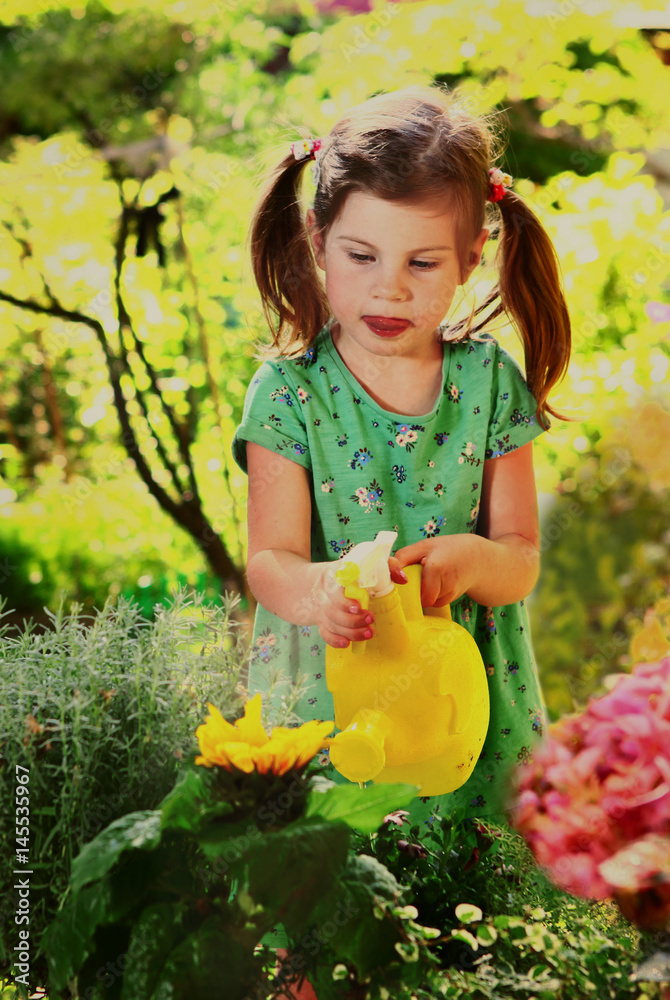 little girl with water can watering flowers in garden