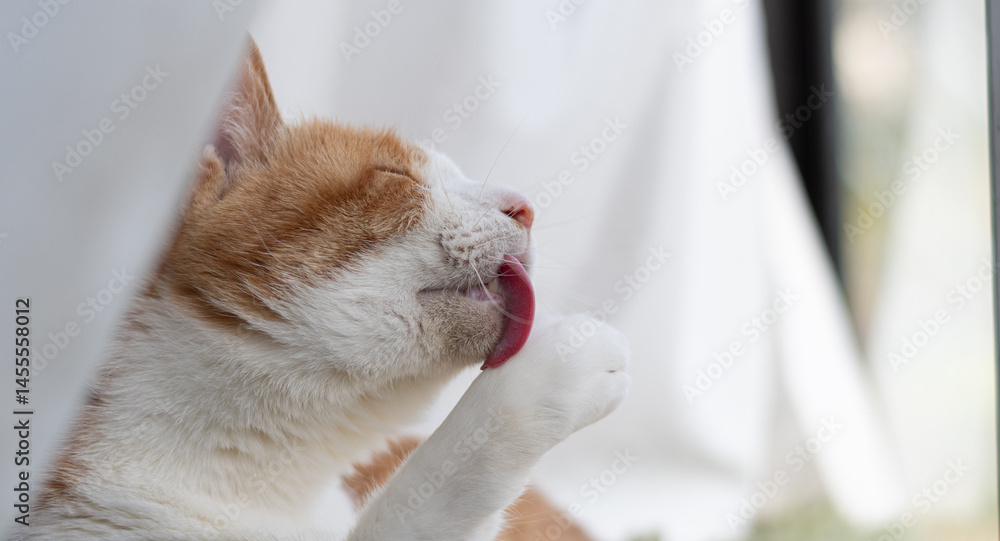 窓辺で毛繕いをする可愛い猫 茶トラ白