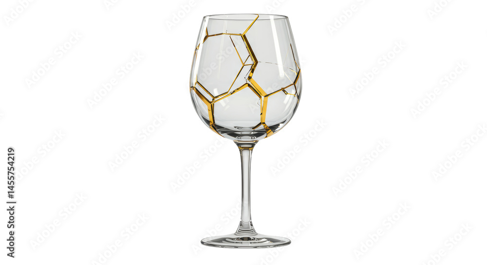 Isolated Kintsugi Wine Glass with Golden Cracks and Repairs