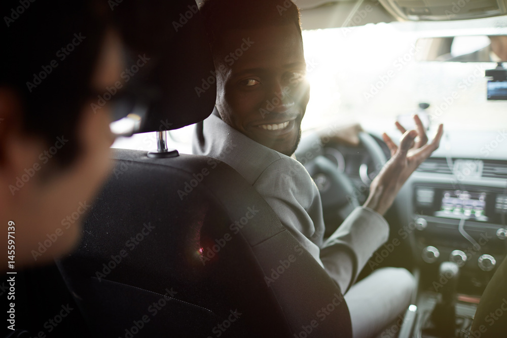 Young car driver asking businessman where to go