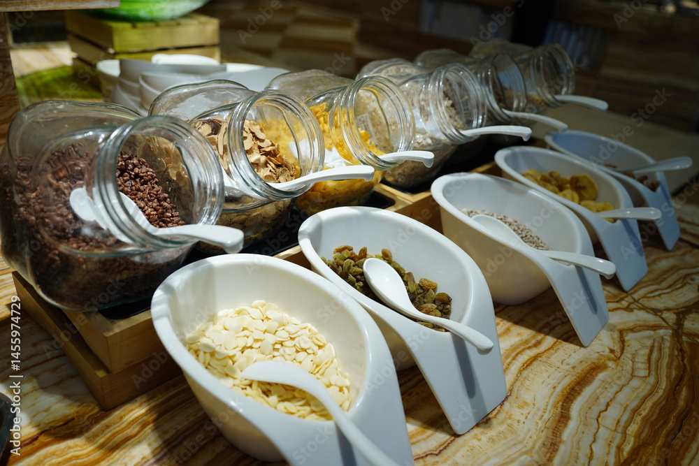 Breakfast buffet with cereals and grains in jars and serving bowls