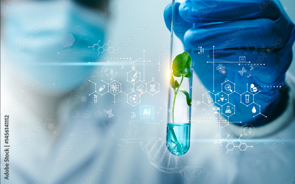 Scientist used biotechnology, ai technology, and dna plant in tube of scientific lab for medical research and Plant genetics development in Food industry. science chemistry in laboratory