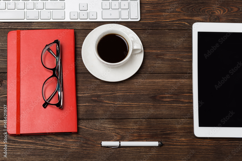 Office workplace with text space. Top view of office dark desk table with laptop, phone, tablet, notebook, and coffee cup. Top view with copy space Modern office workplace.