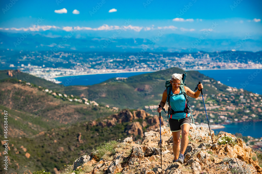 Female hiker hiking the impressive red mountain of Cap Roux at the Massif de L'Esterel on the Mediterranean coast in the French Riviera