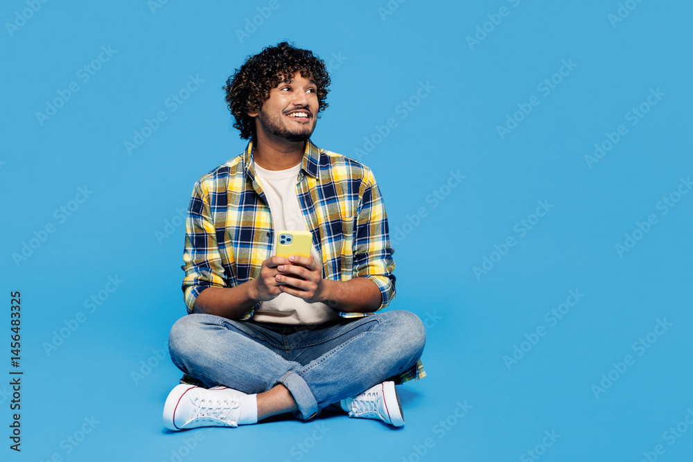 Full body young happy Indian man wear yellow checkered shirt casual clothes sit hold in hand use mobile cell phone look aside on area isolated on plain blue cyan background studio. Lifestyle concept.