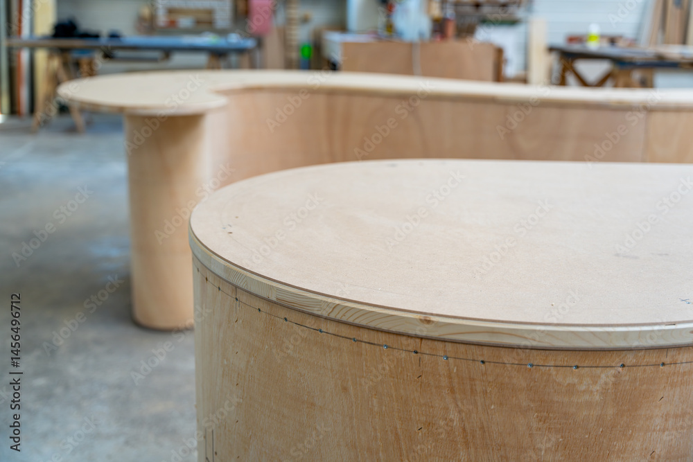 Meuble en bois aux formes arrondies fabriqué artisanalement dans un atelier de menuiserie, mettant en valeur le savoir-faire traditionnel et le design contemporain.