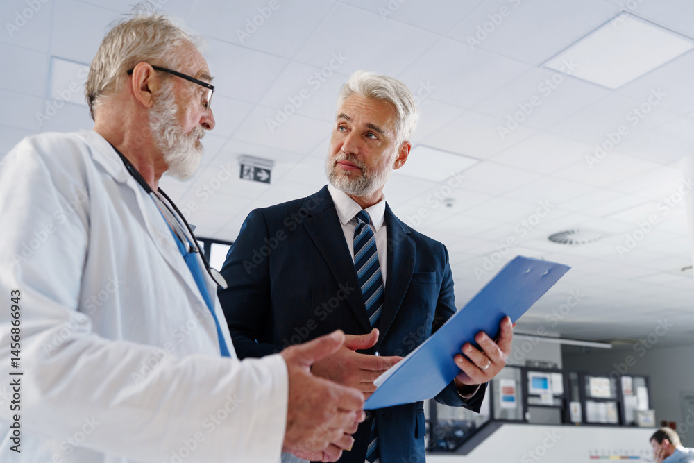 Doctor talking with hospital manager, walking down hospital hallway.