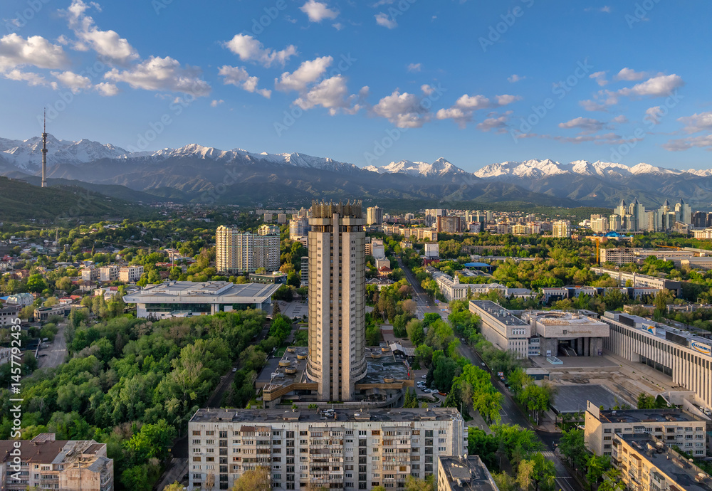 View from a quadcopter of the central part of the Kazakh city of Almaty on a spring morning
