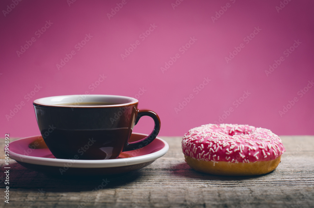 colorful donut with sprinkles on a wooden table and pink background. Cup of coffee. Two types of donuts. Cake and sweet. Food detail. Close up. Pastel color