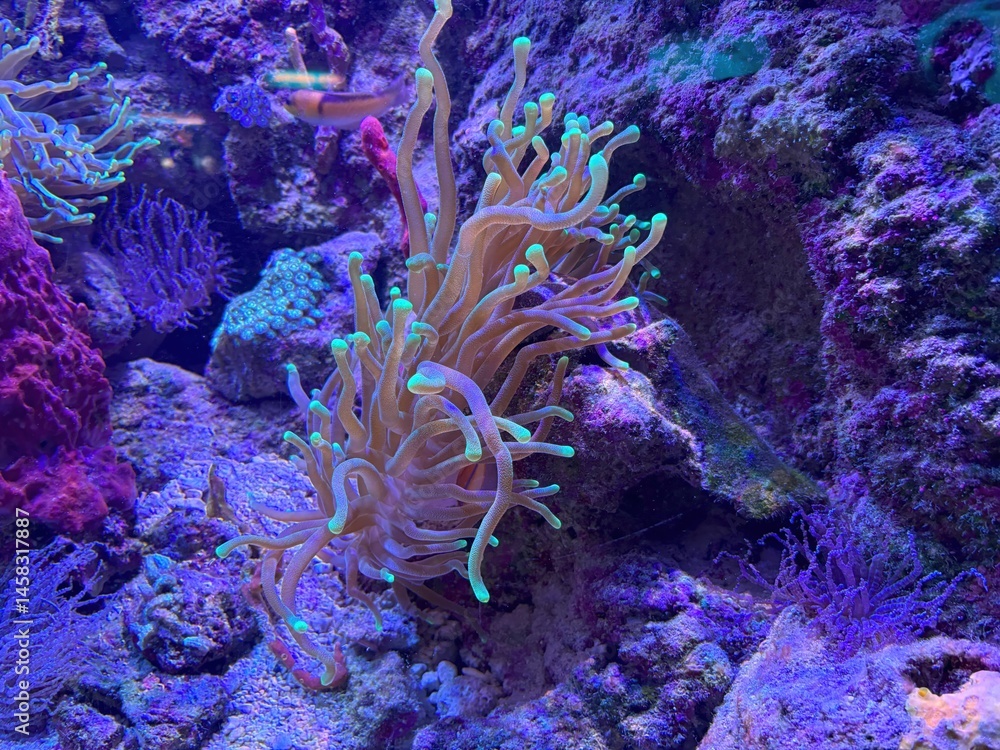 Brightly lit coral reef scene featuring glowing anemones and marine textures in a vibrant, colorful saltwater aquarium environment..