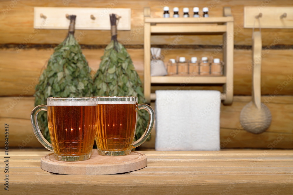 In the sauna interior, glass mugs of light beer on wooden tray stand on a plank bench, against a log wall with dry birch brooms, wooden ladle and shelf with bottles of aromatic oils and white towel.