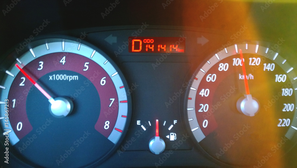 Car dashboard while driving at high speed - a nice number on the odometer, the bright glare of the sun. Blurry