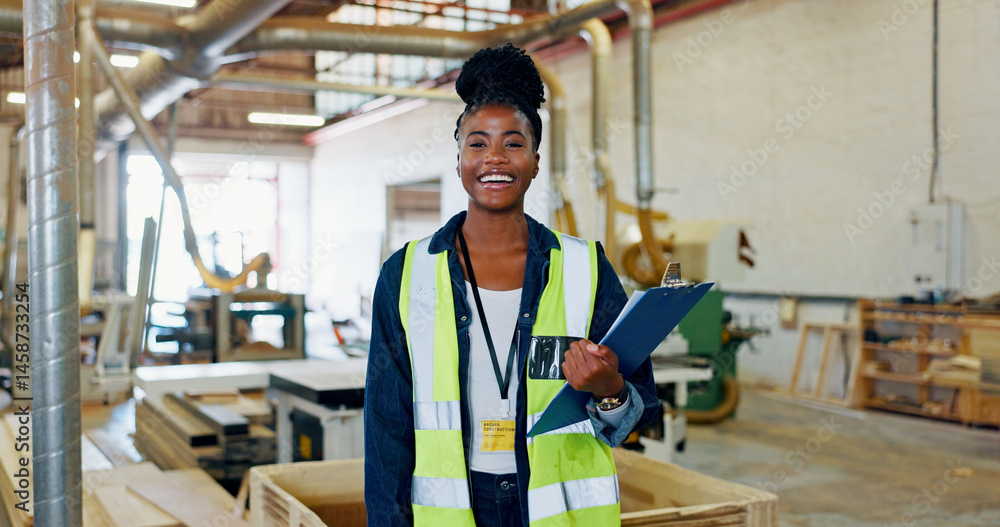 Portrait, woodwork and clipboard with black woman in factory for furniture, manufacturing or inspection. Lumber inventory, cabinetry construction and distribution warehouse with person and checklist