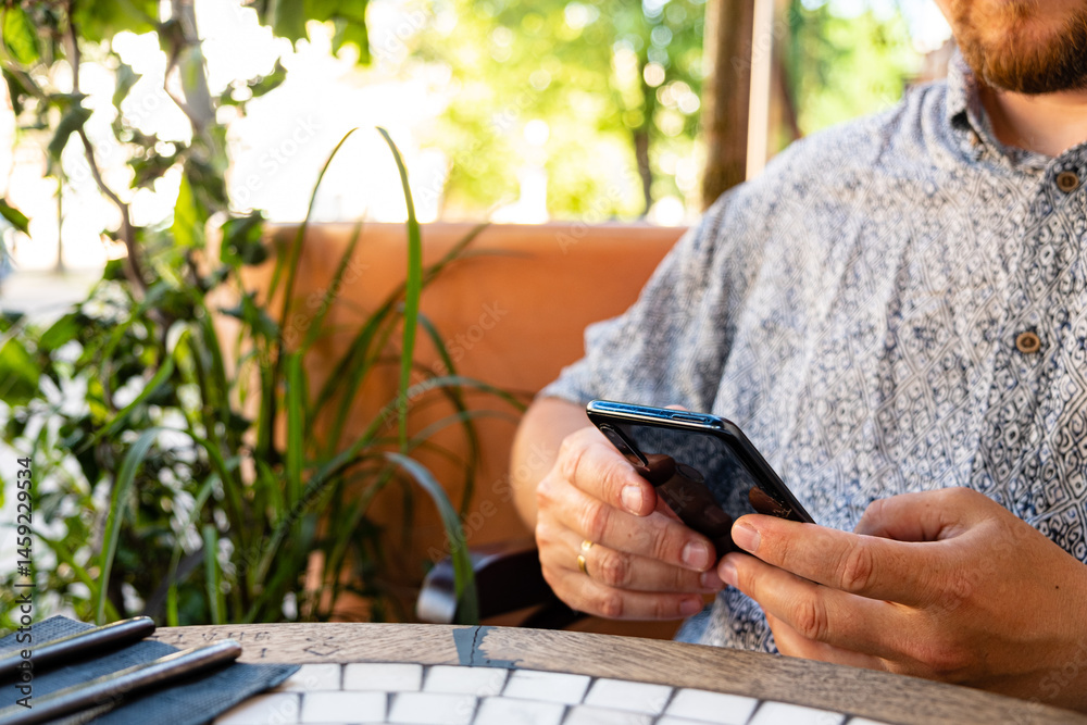 A person at a sunny cafe, engrossed in their smartphone among the greenery