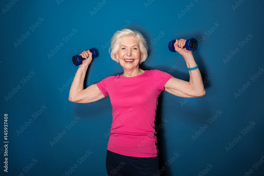 senior fitness woman training with dumbbells isolated on blue