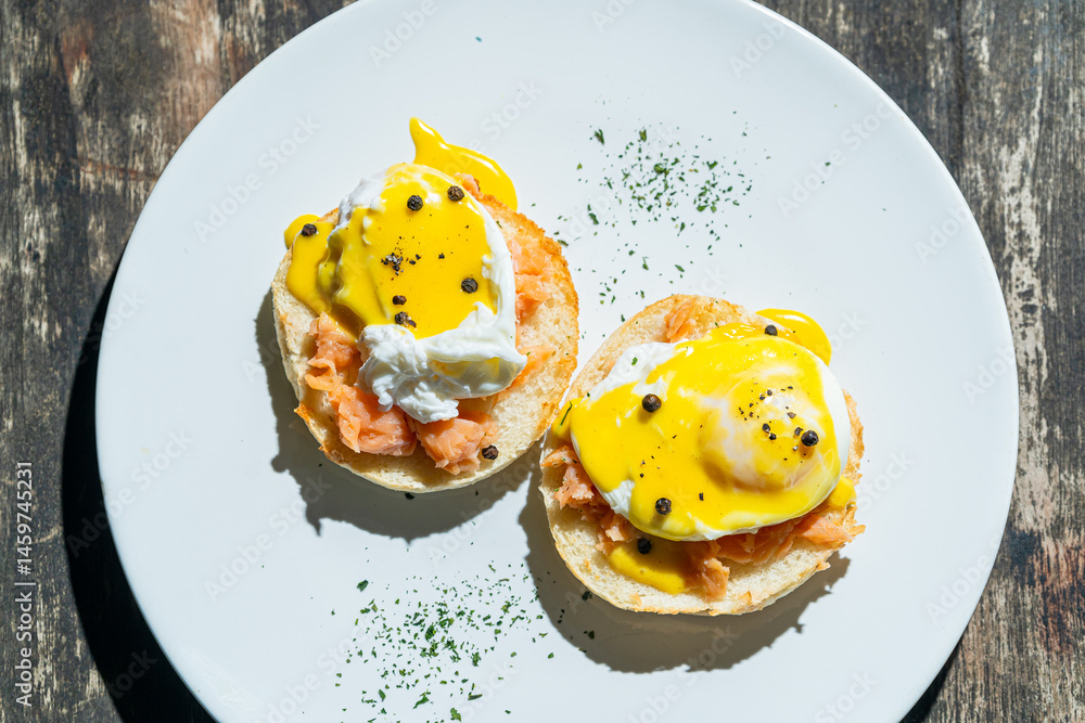 Egg benedict or poached egg with salmon on white plate. Isolated by wooden background or table. Food photography