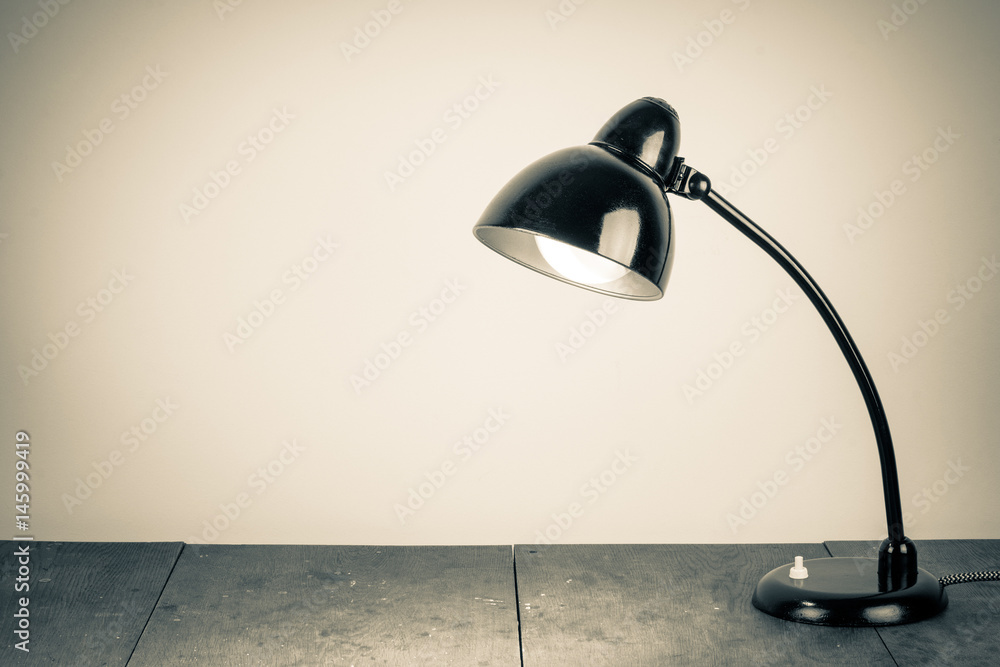 Vintage background with lighting retro desk lamp on wood table