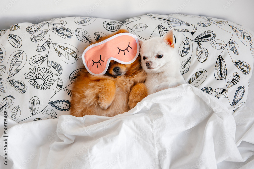 Cute, funny red pomeranian female puppy lying on back in sleeping mask together with chihuahua male on pillows on sofa covered by blanket. Good night. Lovely couple. Dogs resting. Pets. Unity. Animals