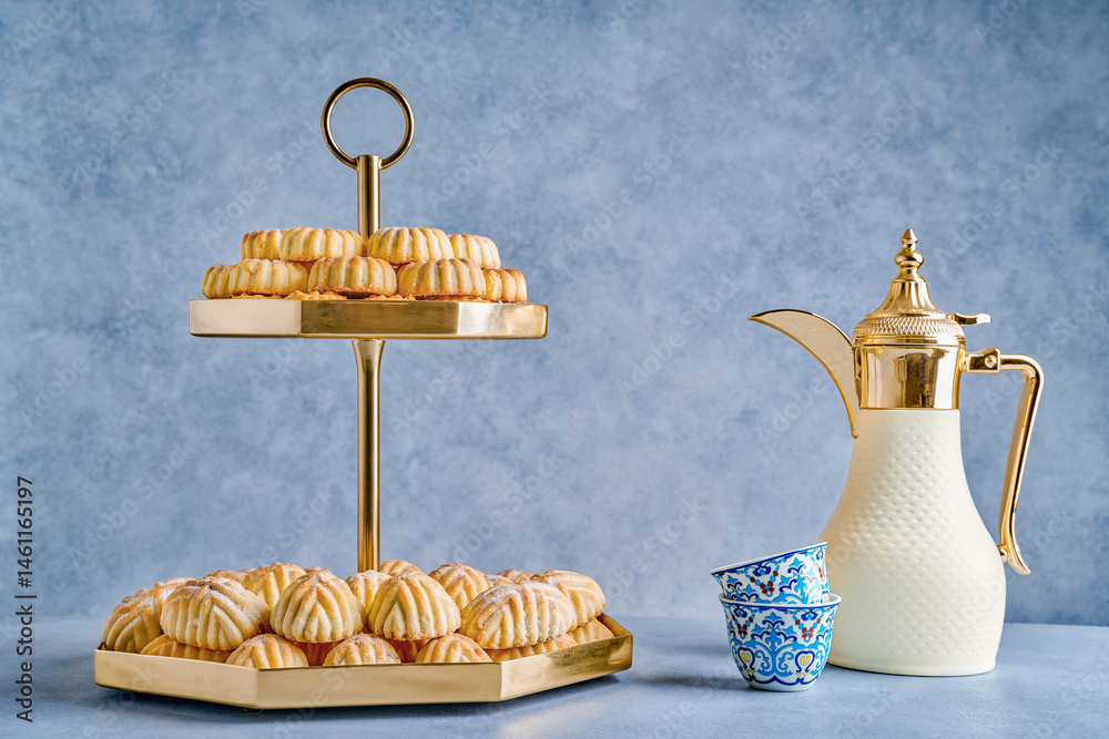 Assorted semolina maamoul or mamoul cookies with dallah . Traditional arabic Eid al Adha, Eid al Fitr sweets
