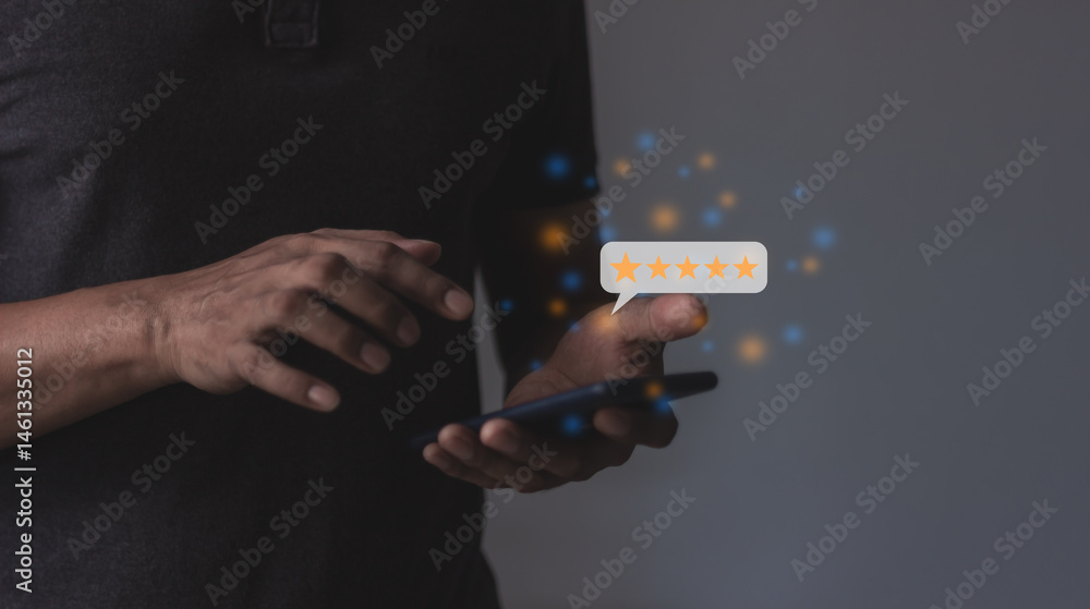 Customer Review, Young Man hand holding Smart Phone with five star to review and give 5 stars with very good results in service, Good review 5 star rating choice feedback