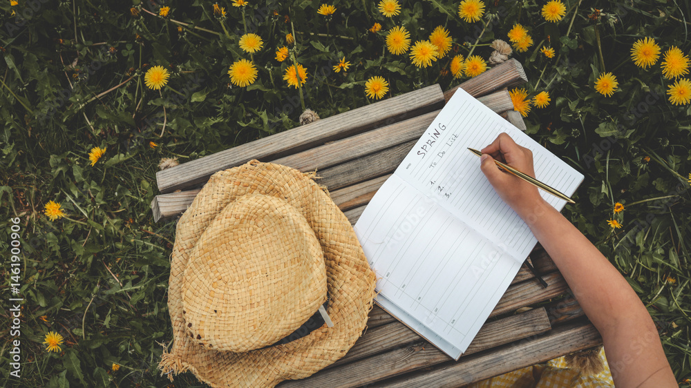 Close-up of a hand writing a spring to-do list in a lined notebook, with a background of blooming yellow dandelions and rustic wooden bench. Seasonal planning in nature
