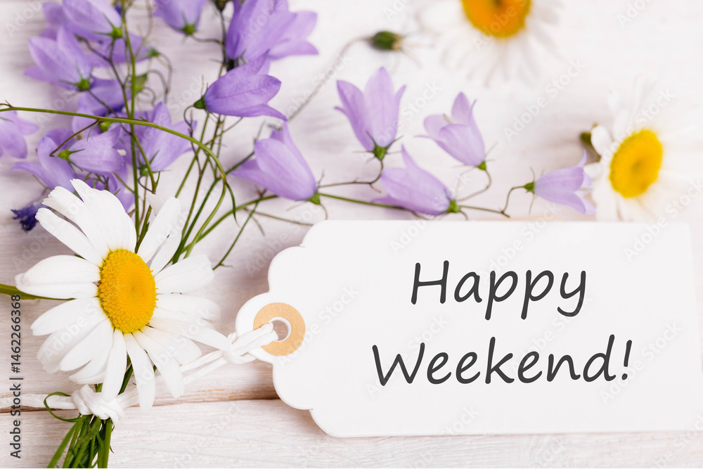 Happy weekend message on white gift tag with daisies and violet bellflowers on rustic wooden background, floral greeting card design, top view composition for summer celebration or weekend wishes