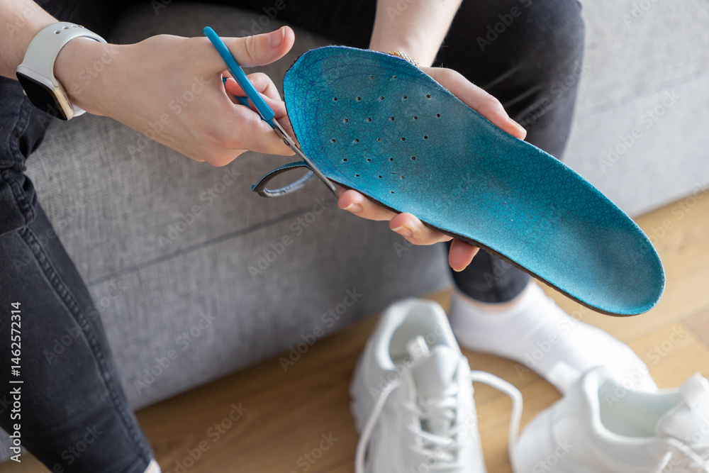 Close up of hands cutting blue insole with scissors indoors, customizing training footwear for enhanced athletic support