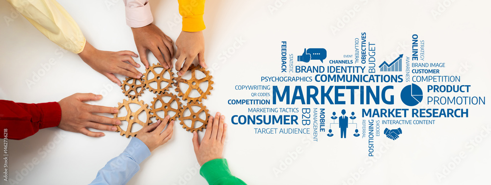 A diverse group of hands collaborates over gears, symbolizing teamwork in marketing strategies focusing on research, branding, consumer engagement, and business growth. Amity