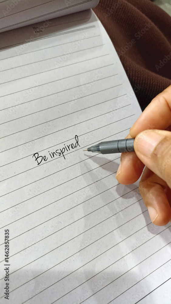 Be inspired. Text messages on a paper with person holding a pen. Encouragement concept. Business motivation quotes. Positive words.