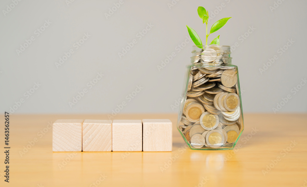A small plants are grown on a pile of coins in glass jar for finance and banking next to the wooden block with copy space