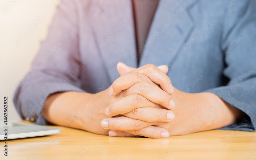 Close up of man clasped hands clenched together on table, businessman preparing for job interview