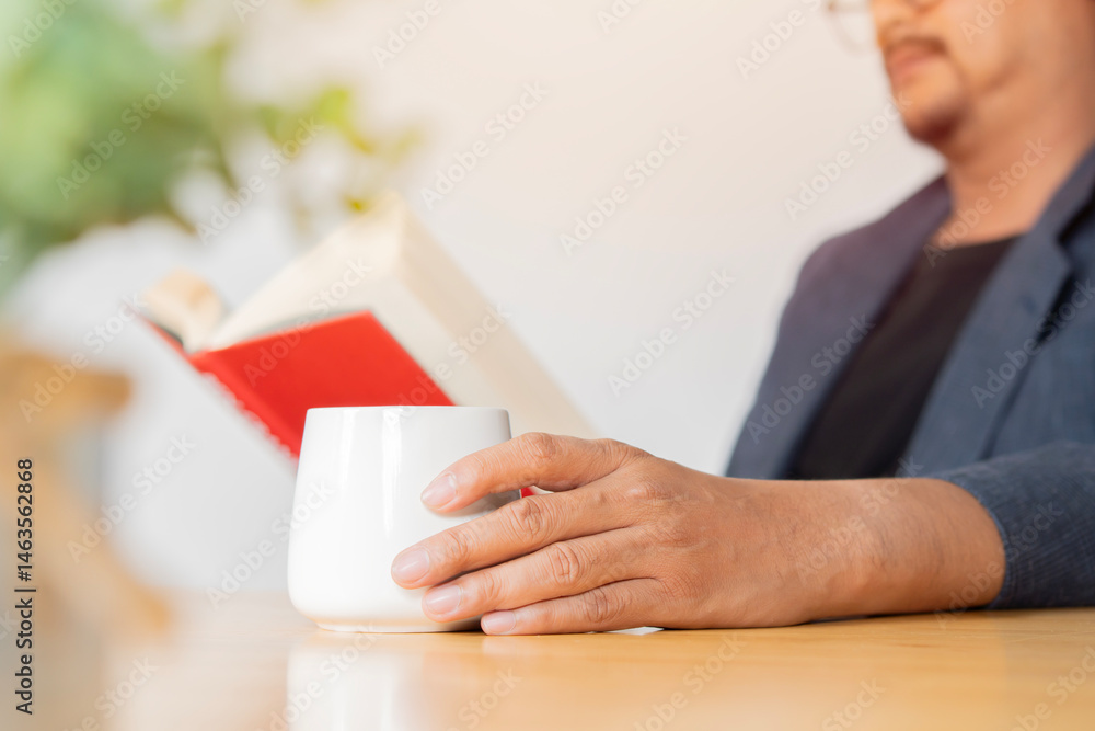Cropped shot of adult man reading book and drinking coffee at the wooden table.