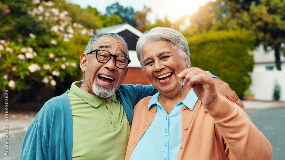 Excited, senior couple and key for new home, real estate investment and property mortgage. Loan, man and woman with keychain for moving, hug or relocation to dream neighborhood with portrait outdoor